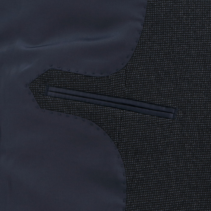 このスリムスーツは、スマートな外観を演出するタイトなデザイン。機能的なタバコポケットが両側にあり、携帯電話などの小物を収納してもシルエットを崩さない工夫が施されています。