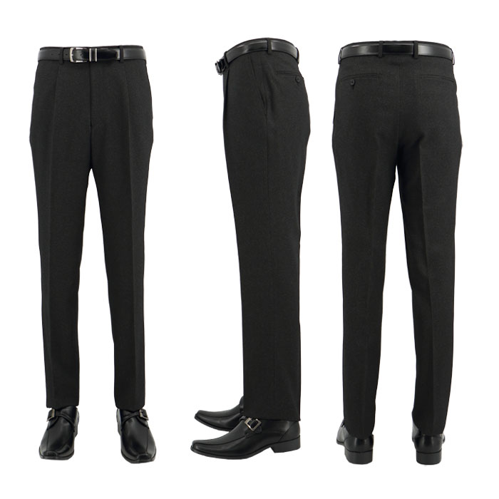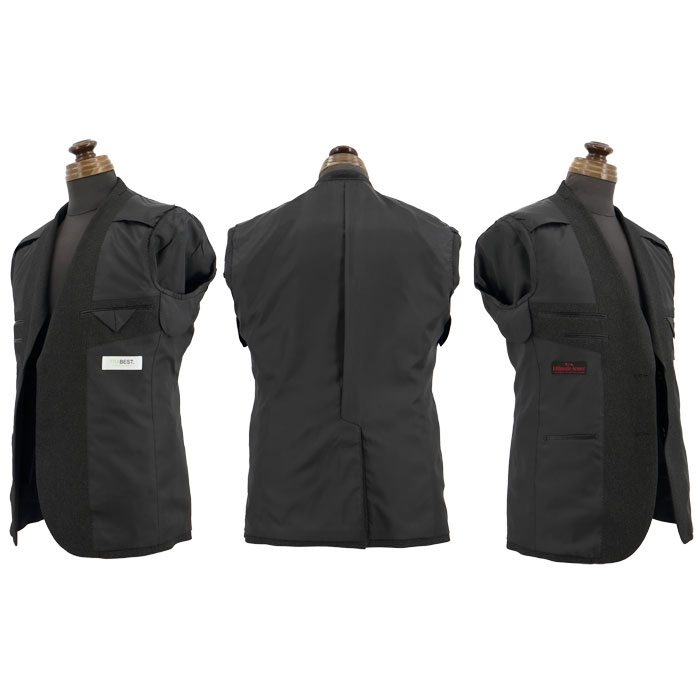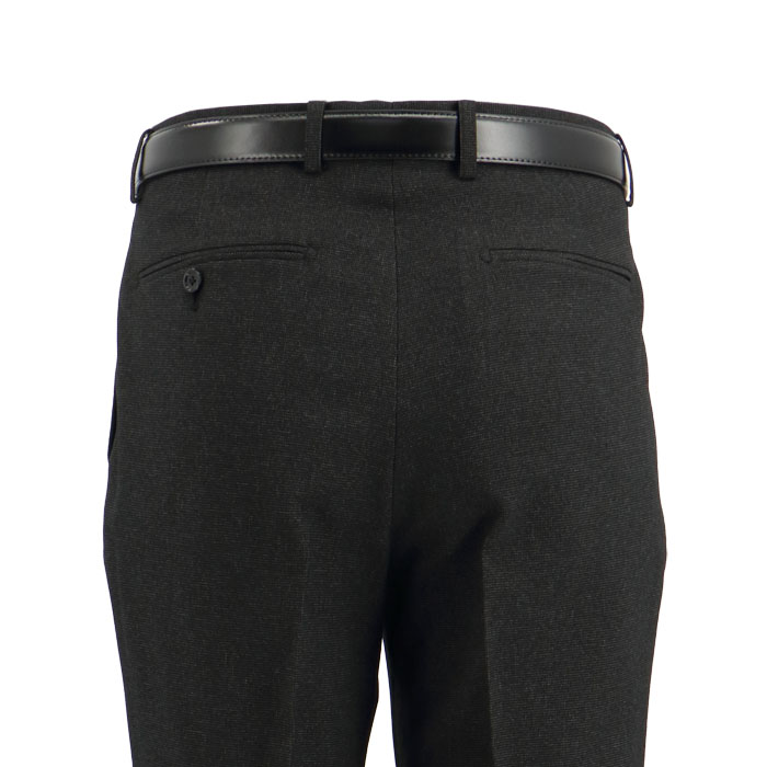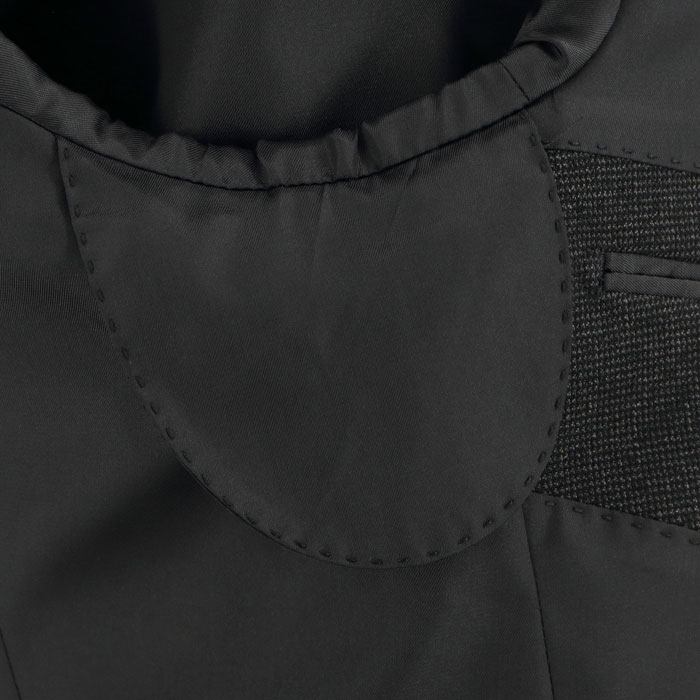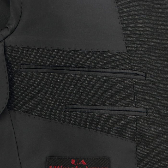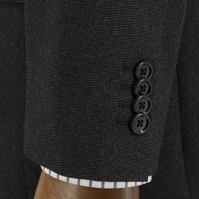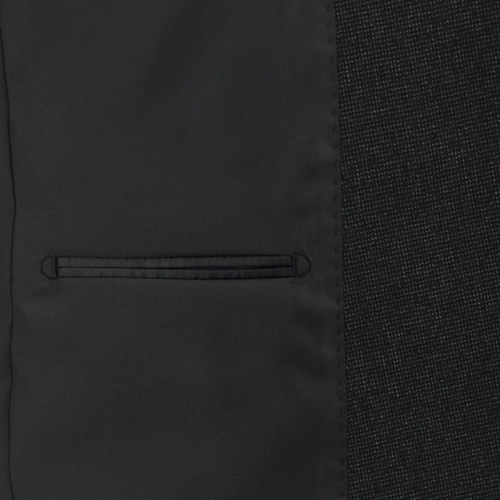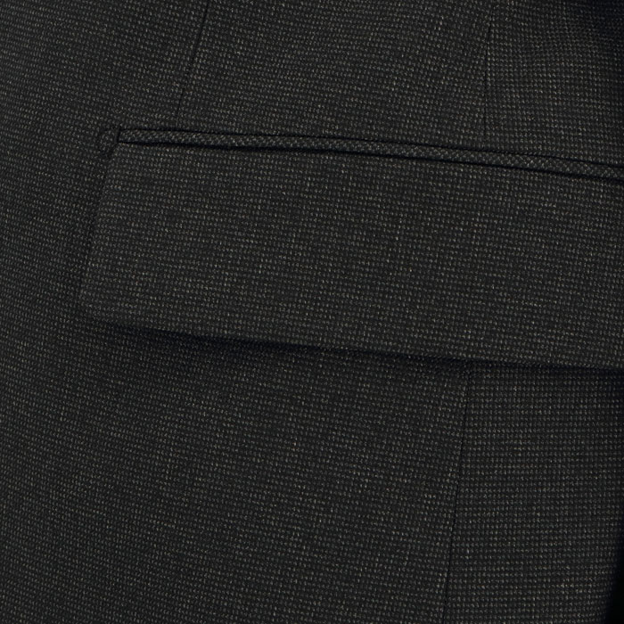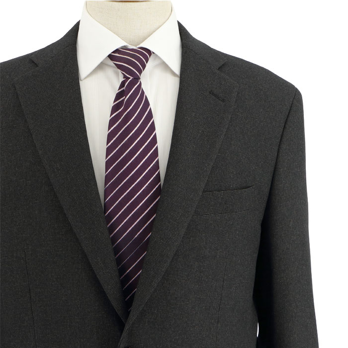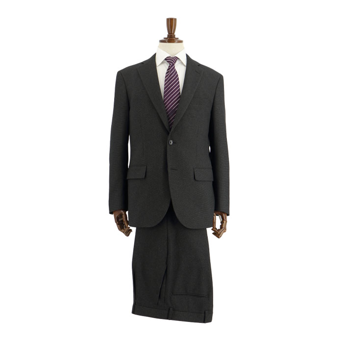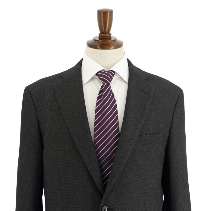デザイン面では、高めのゴージラインとレギュラーラペルが特徴で、チャコール ピンチェック 無地。素材は特殊ポリエステルを使用しており、ウールのような風合いを持ちながらもストレッチ性と防シワ性を兼ね備えています。